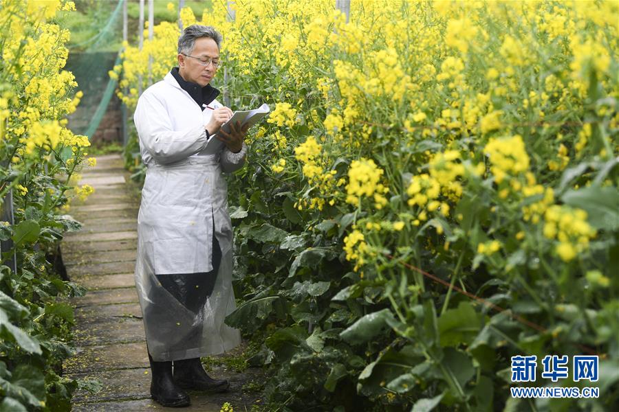 3月5日,重慶市油菜工程技術研究中心負責人李加納教授在觀察記錄油菜生長情況。 時下正值油菜花期,重慶市油菜工程技術研究中心的農學專家帶領學生和技術工人搶抓農時,推進油菜科研和育種工作。 新華社記者王全超攝