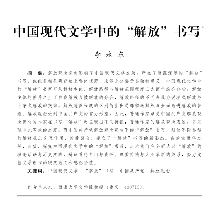 近日,文學院李永東教授撰寫的論文《中國現代文學中的“解放”書寫》在《中國社會科學》(2021年第7期)發表。