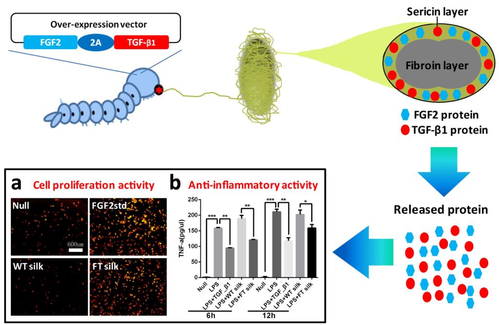 研究人員利用家蠶絲腺多基因生物反應器系統成功將人堿性成纖維細胞生長因子和人轉移細胞生長因子兩種重組蛋白同時表達至蠶絲纖維中,建立獲得可以穩定遺傳的新型蠶絲家蠶素材品系,以實現雙生長因子新型蠶絲的高效低成本生產。隨后,研究人員系統性證實了雙生長因子新型蠶絲具有緩釋、促進細胞增殖、促進膠原蛋白合成以及消炎等多重功效,未來有望開發成復合功能蠶絲生物材料,對拓展蠶絲在組織工程和再生醫學領域中的應用具有重要促進作用。王元成博士、王峰副教授為論文并列第一作者,夏慶友教授為論文通訊作者。