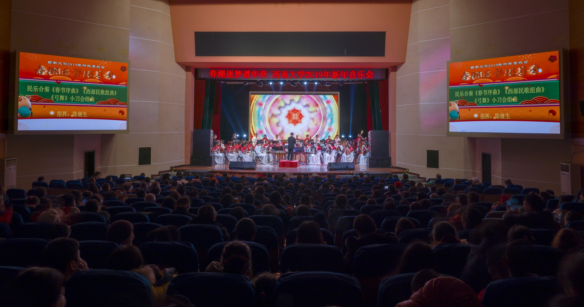 玉犬金聲迎飛雪,天蓬祥瑞送春歸。揚鞭奮進新時代,春潮逐夢凱歌飛。1月10日晚,西南大學光大禮堂鼓樂陣陣,琵琶、嗩吶、揚琴、二胡、笛子、手風琴、大鼓……等二十多種樂器共同奏響春天的和聲,西南大學校工會主辦、音樂學院民族管弦樂團擔綱演出的新年音樂會隆重舉行,以精彩的民族音樂致敬中華優秀傳統文化,慶祝改革開放四十年,喜迎新春的到來。