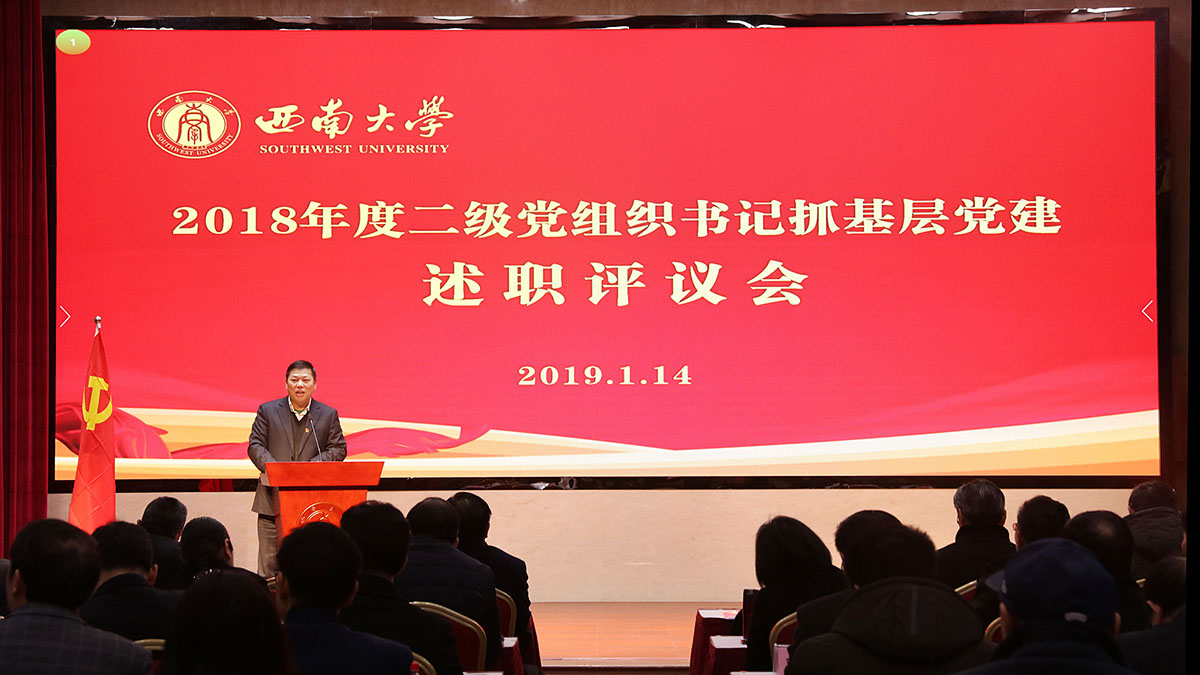 根據教育部黨組和重慶市委教育工委關于開展高校黨組織書記抓基層黨建述職評議考核的工作要求,1月14日,學校黨委召開2018年度二級黨組織書記抓基層黨建述職評議會。學校黨委委員、紀委委員,不是兩委委員的校領導,黨群部門主要負責人,二級黨組織書記所在單位行政主要負責人,部分“兩代表一委員”、專職組織員、黨支部書記、基層黨員干部和師生代表參加會議。會議由校長、黨委副書記張衛國主持。