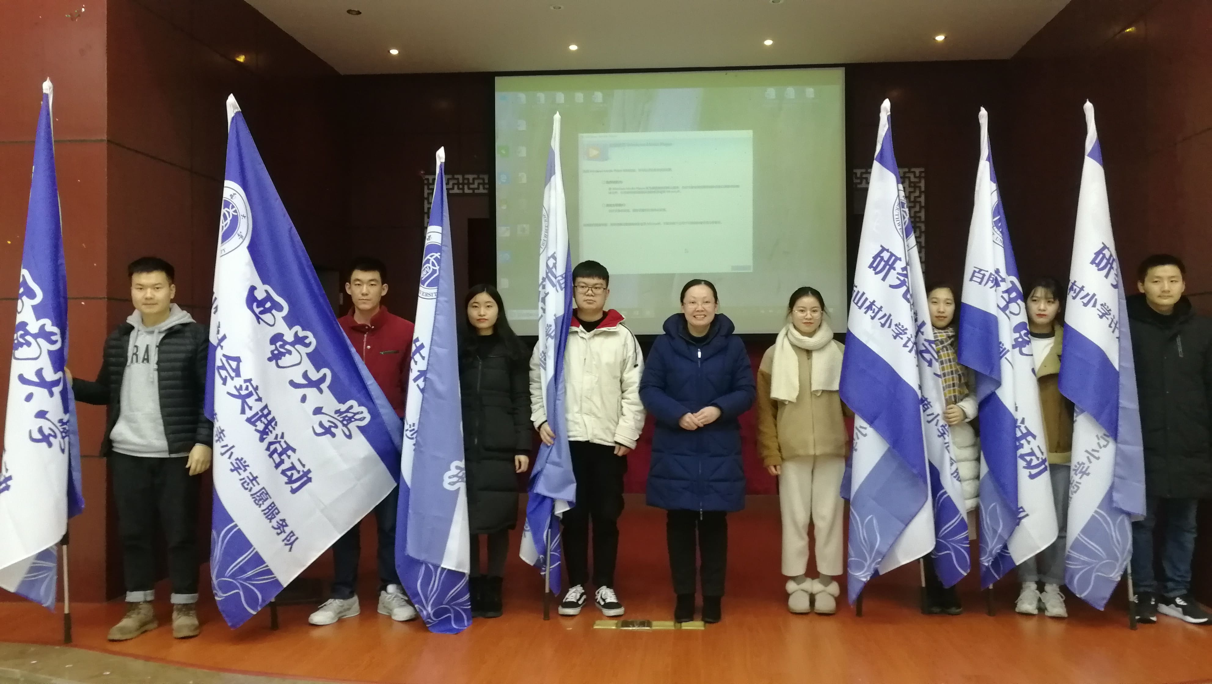 會上,黨委研究生工作部獎助實踐科劉潤宣讀《關于開展2019年寒假研究生社會實踐活動的決定》。黨委研究生工作部副部長胡娟為校級實踐團隊代表授旗。適中學校志愿服務隊范曉文同學和諾西小學志愿服務隊謝佳同學作為實踐團隊代表發言,從實踐內容出發,提出實踐團改變實踐課程形式,因需施教,開展相應的興趣課程,將學院特色帶入鄉村小學,過程中始終將在實踐活動中踐行學校“含弘光大 繼往開來”的校訓,力求展現西南大學研究生良好風貌。