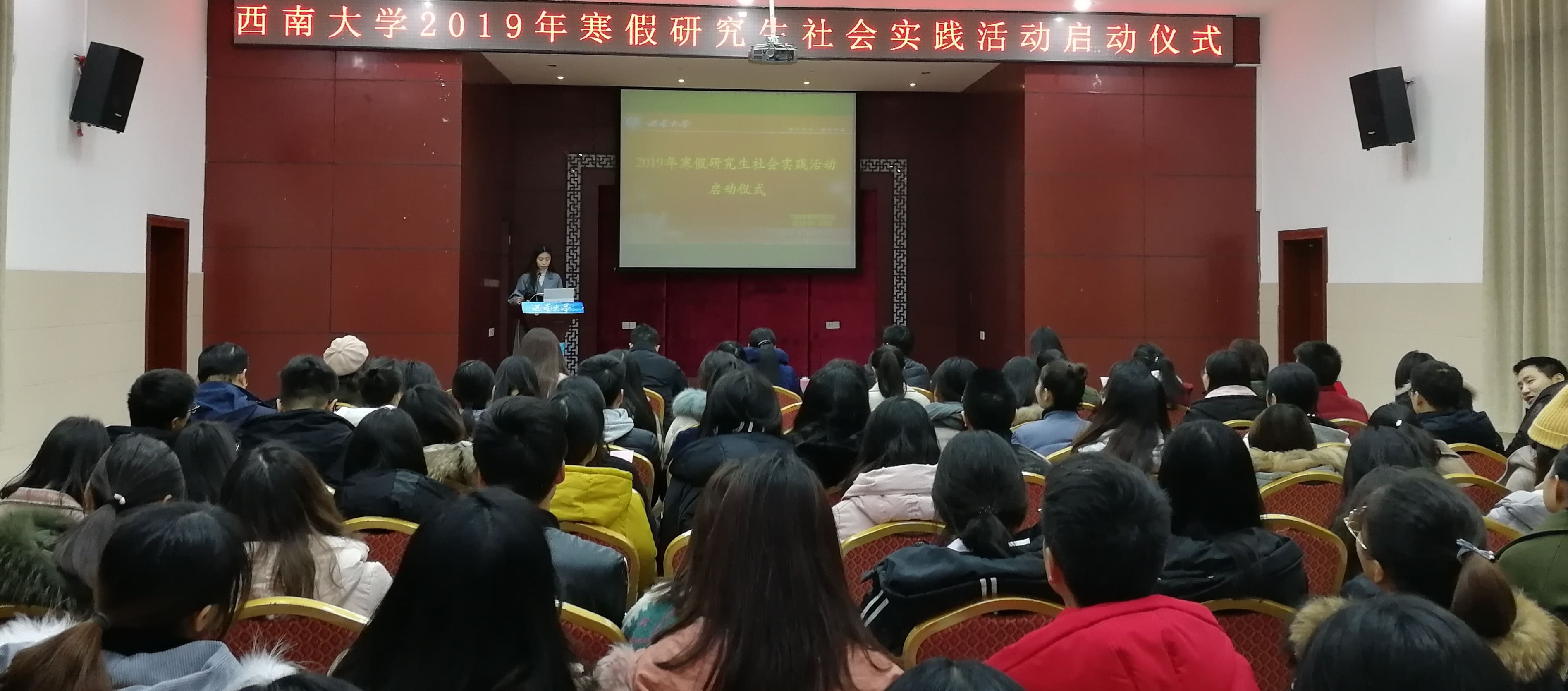 1月9日下午,學校2019年寒假研究生社會實踐活動啟動儀式在八一禮堂舉行。黨委研究生工作部相關老師、各校級實踐團隊指導教師、校研究生會主席團成員、社會實踐部工作人員、26支“百所山村小學計劃”志愿服務活動校級實踐團隊代表參加啟動儀式。儀式由校研究生會副主席王菁菁同學主持。
