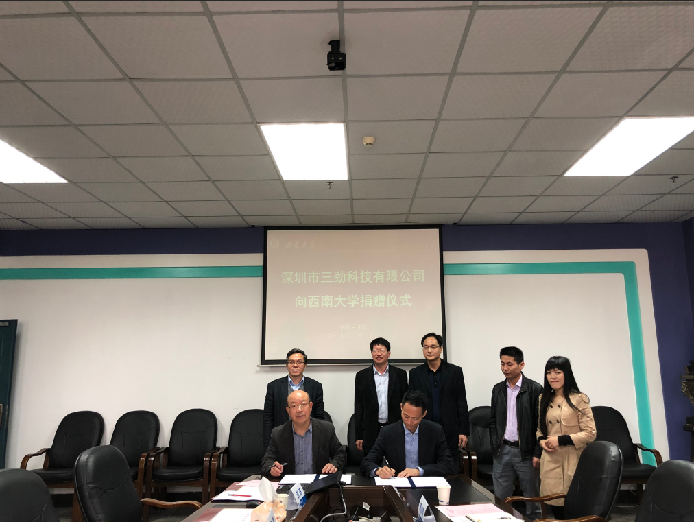 3月29日,深圳市三勁科技有限公司向西南大學捐贈簽約儀式在計算機與信息科學學院 軟件學院舉行。參加簽約儀式的有深圳市三勁科技有限公司創始人兼CEO、學校外國語學院87級校友李慶康,深圳市三勁科技有限公司研發副總裁周小雄,測試經理龔燕英,學校對外聯絡部部長、教育基金會秘書長龔常智,副部長劉濤,外國語學院黨委書記文旭,計算機與信息科學學院 軟件學院院長肖國強、張自力教授等。儀式由劉濤副部長主持。