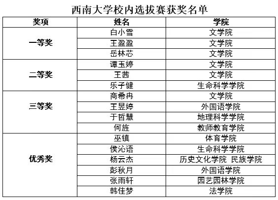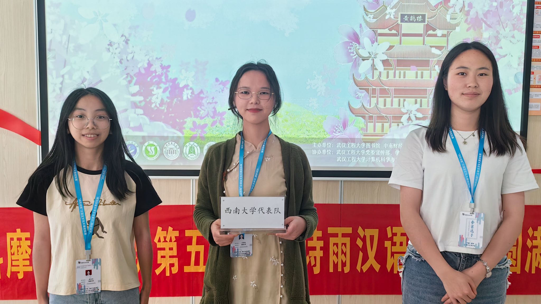 4月29日,學(xué)校學(xué)生線上參加了在武漢工程大學(xué)圖書館舉辦的第五屆“詞風(fēng)詩雨”漢語言文化大賽總決賽,來自文學(xué)院漢語言文學(xué)專業(yè)的王盈盈同學(xué)在比賽中發(fā)揮穩(wěn)定,榮獲校際個人賽總冠軍;白小雪、岳林芯獲得校際個人賽優(yōu)秀獎;王盈盈、白小雪、岳林芯組成的西南大學(xué)代表隊在比賽中榮獲團體賽冠軍。