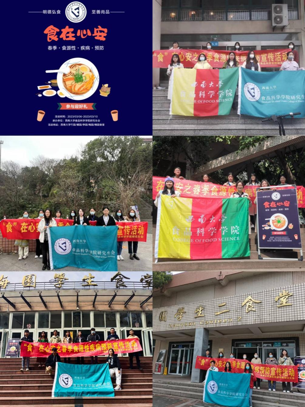 3月6日至3月10日,由食品科學學院研究生會主辦,食品科學學院研究生會實踐部承辦的“‘食’在心安之春季食源性疾病預防宣傳”公益活動分別在西南大學竹園、橘園、李園、梅園、楠園五個園區食堂順利舉行。活動參與者由研究生會成員和志愿者共50人組成,活動旨在提高同學們對食品安全的認知和預防意識。