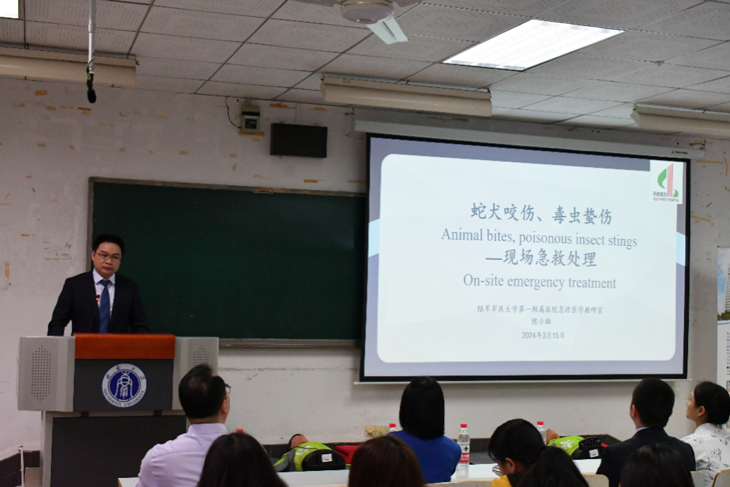 急救部前區(qū)負(fù)責(zé)人陳小雄圍繞蛇犬咬傷、毒蟲蜇傷等常見意外傷情,對(duì)緊急處理方法進(jìn)行了講解。結(jié)合西南地區(qū)蛇蟲種類與數(shù)量繁多的實(shí)際情況,陳醫(yī)生圖文并茂講解了各類蛇蟲咬傷后的處理方法,針對(duì)重慶地區(qū)蛇蟲分布他還指導(dǎo)同學(xué)們重點(diǎn)學(xué)習(xí)了幾種常見毒蛇的識(shí)別、規(guī)避和咬傷緊急處理方法。