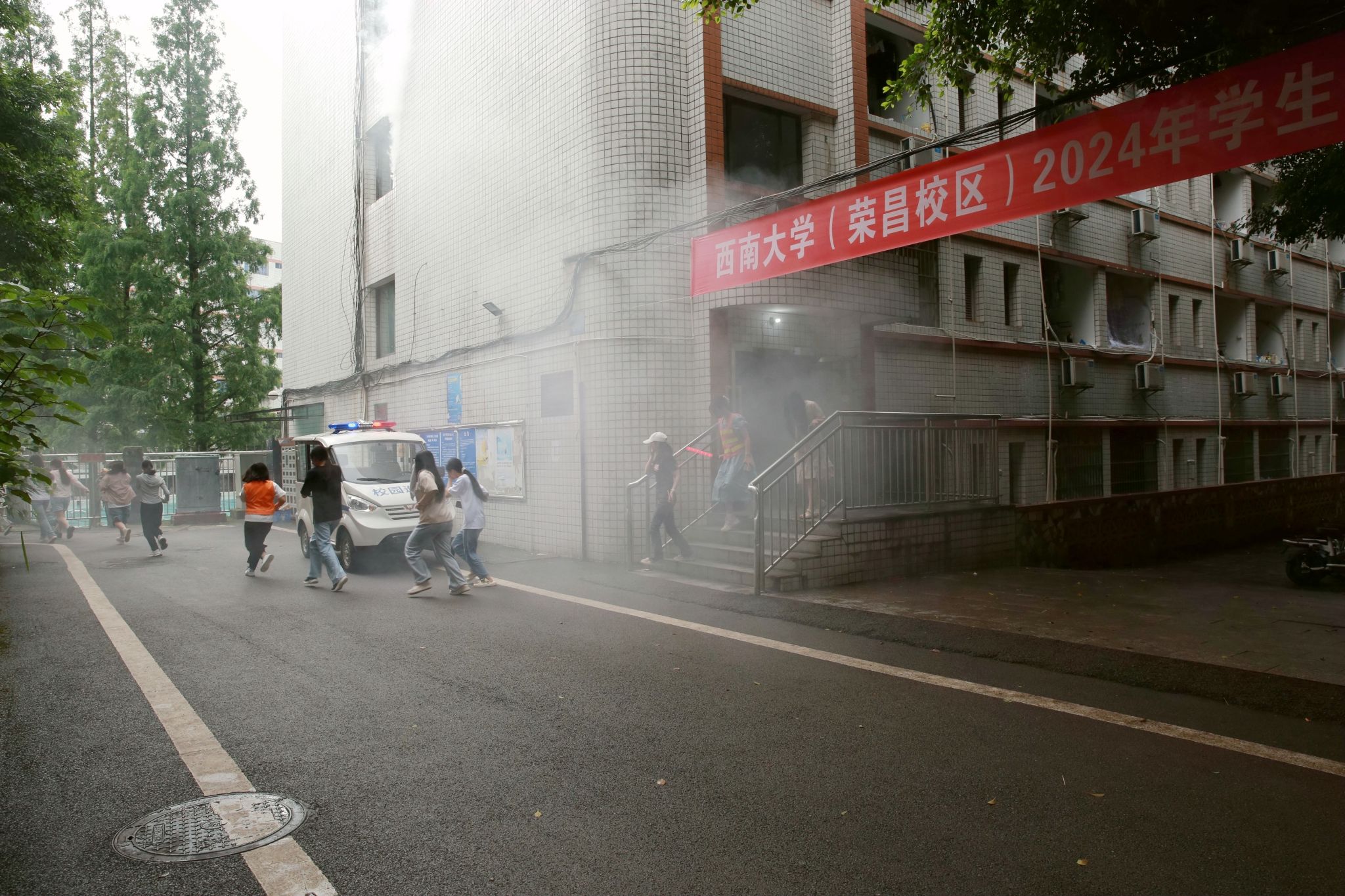 15:00整,學生活動中心,隨著西南大學榮昌校區黨工委書記周國安“演練正式開始”聲落,大屏幕出現榮昌校區學生宿舍6舍3樓走道的畫面,隨著飄出的滾滾“濃煙”,306寢室沖出3名同學,只見一名同學打開走道處滅火器箱,取出滅火器,沖到“著火”寢室門口滅火,1名同學下樓向宿管員報警,宿管老師從值班室出來,邊走邊撥打電話,跑到2樓配電房切斷了整棟宿舍的電源,拿起滅火器沖向3樓滅火。此時,整個樓道已經煙霧彌漫,各樓層學生在手拿熒光棒的樓棟志愿消防隊引導下,用毛巾捂住口鼻,低姿快速有序疏散,其他宿舍的宿管人員也趕來支援。畫面出現身著消防服的應急處突小組,在起火宿舍走道利用室內消火栓,鋪設消防水帶滅火。此時,學生已分散撤離至安全區域,室外醫務人員和救護車嚴陣以待。